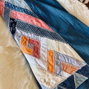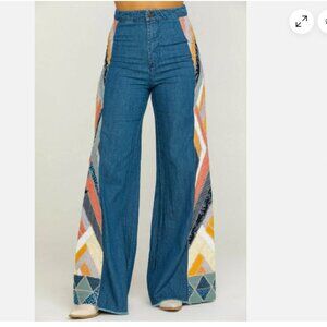 Fabulous patchwork flare jeans. High waisted. These jeans compliment your curves and they're comfortable! Worn only twice. Hemmed at the bottom. I'm 5'7" and they fit perfectly with a small wedge.