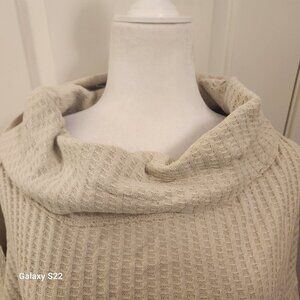 Free People "Stone Cold" Sweater. NWT. Size Small. Oversized. Thermal look. Crossover back. Frayed edges. Cream color. No rips/stains or tears. Material: 100% cotton, soft. This brand/style is oversized. Smoke free home. No odors. All offers are welcome. Thank you!
