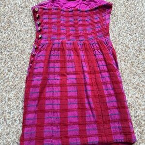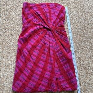 Vibrant strapless dress by Free People. Features a bold red and pink plaid pattern. Perfect for a stylish look.