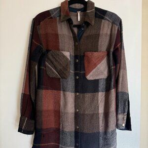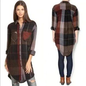 Free People x-small brown plaid long sleeve flannel shirt dress or shacket! Has snap button closures, two front chest pockets and two side pockets. Slight piling due to nature of fabric. Cozy flannel material makes it perfect for fall!