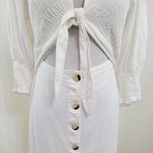 Free People String of Hearts Maxi dress in white. The definition of an effortless essential, this forever timeless maxi dress features a tie-front, puff sleeve top detail and button-front bottom piecing with cutout feature at center for added dimension. Fabric is heavier and flows beautifully.