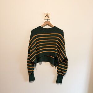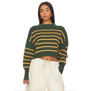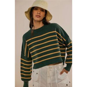 Free People Stripe Easy Street Crop Sweater in Hunter Green & Gold. So classic in stripes, this forever essential pullover sweater is featured in a slouchy, cropped silhouette and ribbed knit fabrication with mock neckline, defined seaming, and slightly exaggerated sleeves for added shape. Features: Mock neckline, striped print, dropped shoulders, defined seaming, exaggerated hems. In good condition. No holes, rips, or stains. Ours is a smoke free home.