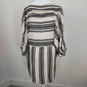 Size Medium Free People Stripe Peasant Lily Mini Dress. 100% cotton and partially lined. Gray and cream striped. Pullover style. Comfy and oversized. 3/4 puffed sleeves. Waist 19.5" Shoulder to hem length 34.5". Very good pre-owned condition