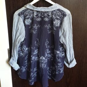 A light, airy button down top made of cotton & spandex for added comfort. The buttoned up stripe is accented with a sheer back with a subtle floral print. The perfect shirt for a summer day & white shorts! Lightly worn, slimming fit, and lovely light blue color.
