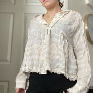 Free People Striped Hooded Flowy Button Down Shirt Sz Medium Raw Hem Neutral