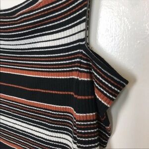 Stylish off-shoulder top with stripes. Features black, white, and orange colors. Perfect for casual outings.