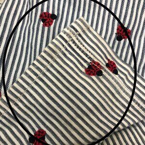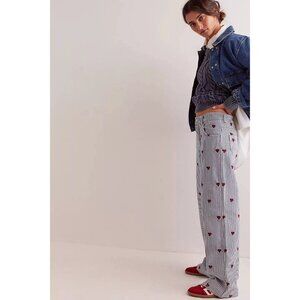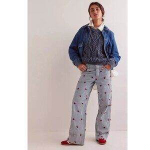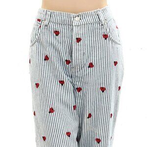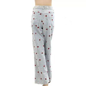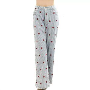 Stylish striped pants with red floral accents. Straight leg design. Perfect for casual wear.