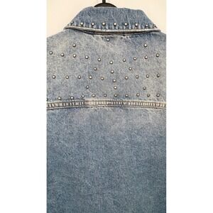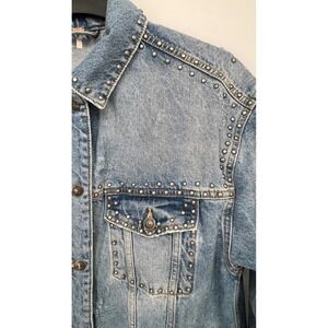Keywords: Free People denim jacket, studded denim jacket, distressed denim jacket, blue wash denim jacket, women's denim jacket, classic fit denim jacket, edgy jacket, silver studded jacket, long sleeve denim jacket, outerwear, fashion jacket, casual jacket