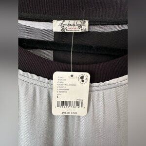 Stylish colorblock top featuring a blend of black, gray, and cream. Perfect for a chic, casual look.