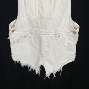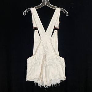 Winter white (an off-white shade) Summer Babe Denim Shortalls by the We the Free line of Free People. Featuring distressed / frayed hems and upturned side hems. Excellent pre-owned condition. Size 26 - about a size XS typically.
