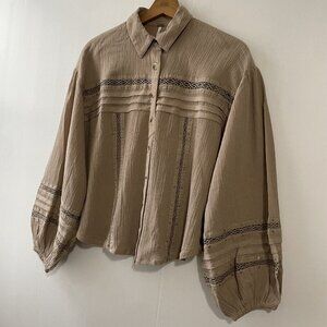 Free People Summer Stars Puffy-Sleeve Button Down Crochet Trim Top XS Brown