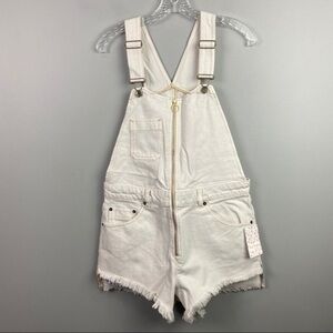 New with Tags. Adjustable short overalls. Zip front. Belt loops. Front and back pockets. Frayed. Cut print on pocket lining! Made of 100% Cotton.