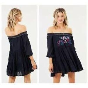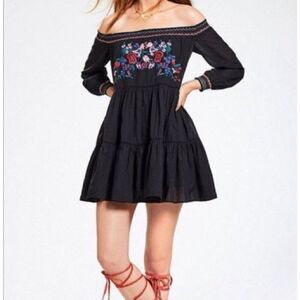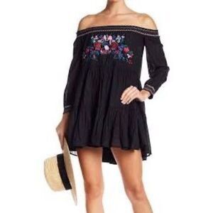 Free People Sunbeams Mini Dress in Black ~ Chic off-the-shoulder mini dress ~ Vibrant floral embroidery detailing in Pink, Red, White & Blue ~ Contrast stitching on smocked elastic panels
