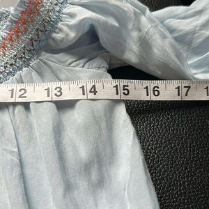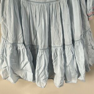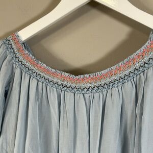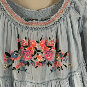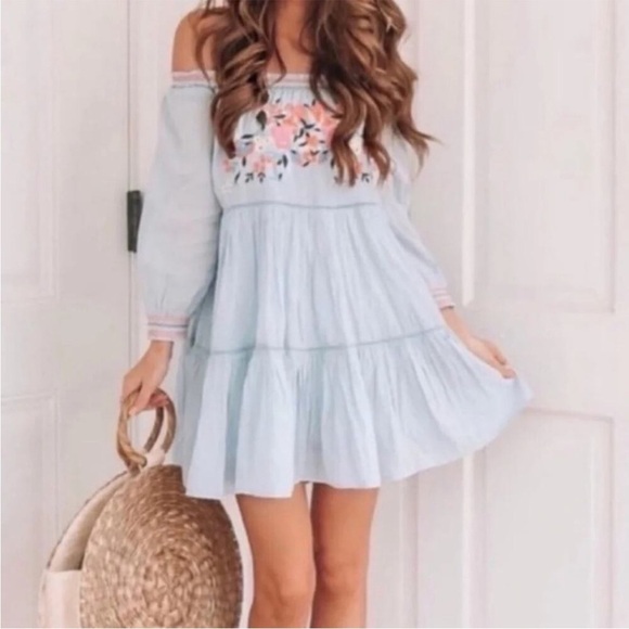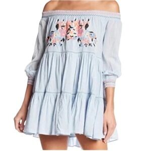 Perfect your summertime look with this Free People Mini Shift Dress. Off-the-shoulder dress boasts a tiered A-line shift with stunning embroidery at the bust. Smock neckline and Bracelet-length sleeves with gathered cuffs. A beautiful cute very charming perfect dress for spring and summer.