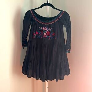 You will embody a boho-chic vibe in this Free People A-line tiered mini dress, with a flowy silhouette that swings with you. It has a flirty shoulder-baring design, with an elegant floral embroidery on the front and vibrant embroidery at the neckline and cuffs. It features a pullover style. Dress it up with cute sandals or your favorite heels. You are sure to make a statement wherever you go in this dress.