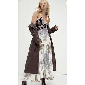 Perfect in a pieced patch design, this effortless maxi dress is featured in a V-neck silhouette with lace trim and pleating at bottom for added dimension.