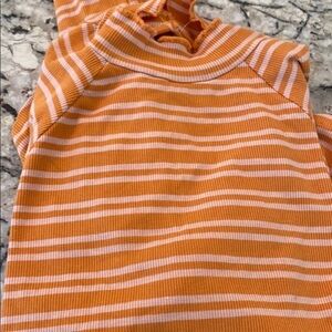 Cute snap button detail on cuffs. Sexy cutout back. Ribbed orange stripe fabric stretches to fit your body.