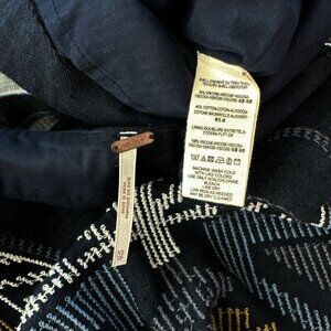 Pull on tunic style mini dress with squared v-neckline. Long sleeves. Small slits on each side of hem. Slightly longer in back. Lined. Tones of blues, grays and golden brown. Stripes and embroidered tribal design. Fabric has a linen like feel to it.