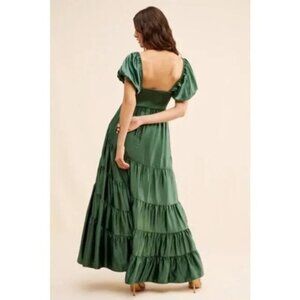 This ethereal emerald green maxi dress is a vision of elegance and whimsy. With its puffed sleeves and tiered design, it flows like a dream.