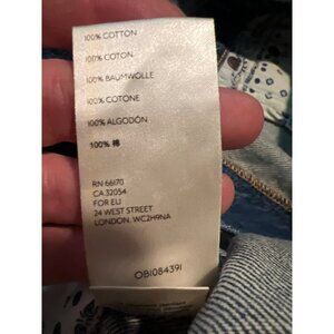 Slight fading on denim fabric; front to bottom hem = 29 inches, waist = 15 inches, inseam = 2.5 inches.