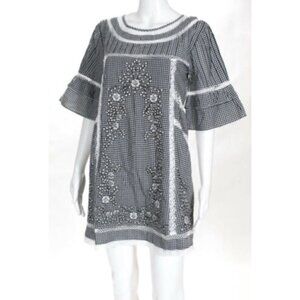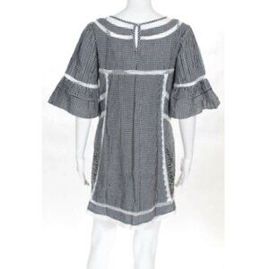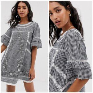 Gingham printed mini dress featured in a shapeless silhouette with fagoting trim and embroidery detailing. Slip included.
