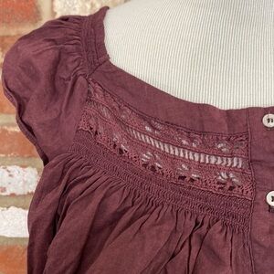 Burgundy wine ruffled, square-neck top is featured in a cropped, button-front silhouette with lace trimming throughout for added dimension.