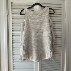Free People Sunrise cold-shoulder top. Color is a cream/oatmeal. Raw edges, waffle knit. Size small. Gently worn, in excellent used condition. A few loose threads along the raw edge hem.