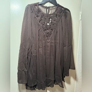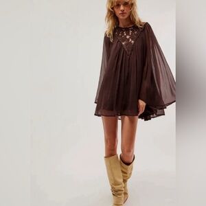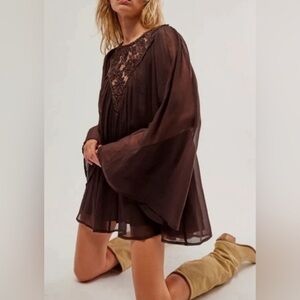 Free People Sunshine of Love Lace Front Sheer Bell Sleeve Mini Dress. Small. Color: black coffee
