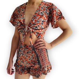 One piece Free People romper disguised as a top and shorts set. So cute! Top ties at the front. Shorts have ruffled bottom hem. Side zipper on the shorts. Butterfly sleeves. Excellent pre-owned condition. Size 8.