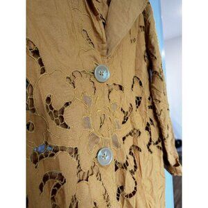 Beautiful eyelets intermingle with inset ladder lace on this compelling coat cut from airy cotton and linen. Color: Mustard. Notched lapels