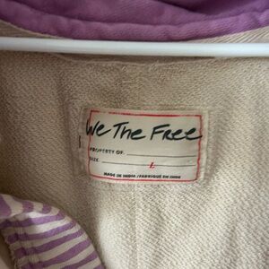 Cozy beige hoodie with purple lining. Striped purple accents on sleeves.