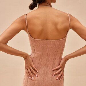 Features: Soft knit fabrication, square neckline, sleeveless silhouette, ribbed hem, low-back detail, minimal design