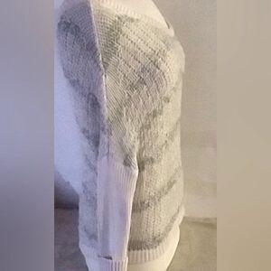 Casual, comfortable and captivating striped pull over off the shoulder sweater. It has a scoop neckline and a deep V in the back. A braided cord across the shoulders / behind the neck keeps the sweater in place but still allows it to drop over the shoulder ( s ) if desired. It has drop sleeves. Most of the very long sleeves are ribbed and designed to be scrunched, folded over or pulled down over the hands for warmth or comfort. It is a longer, oversized, slouchy, cropped style that hits below the waist. It is in excellent pre-owned condition with no flaws upon inspection.