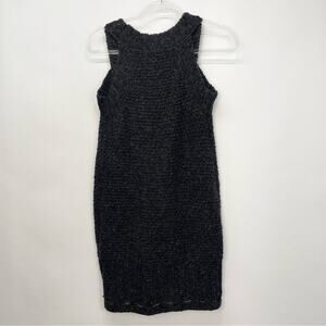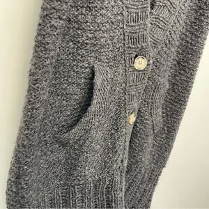 Sleeveless wool blend tunic length sweater vest with button front and two functional pockets.