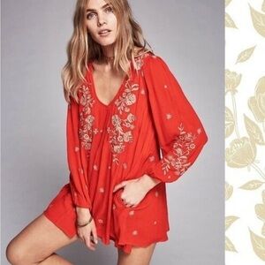 Free People Sweet Tennessee Red Floral Embroidered Mini Tunic Dress S Boho Beach