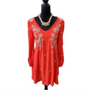 Free People Sweet Tennessee Red and Tan Embroidered Long Sleeve Swing Dress Sm