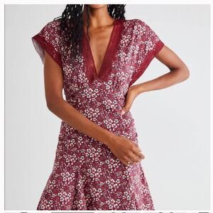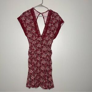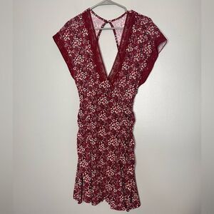 Size M. Merlot red mini dress Floral print with lace trim Plunging v neck Keyhole closure at back Dropped dolman sleeves Excellent condition