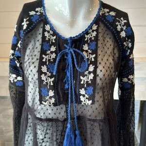 Free People Swiss Dot Sheer Mesh Black Floral Embroidered Peasant Top Size XS