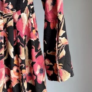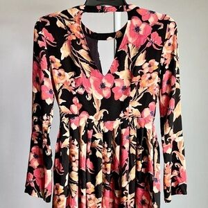 Free People Sz 2 Mini Dress Tegan Floral Swing Bell Sleeve Black Combo EUC