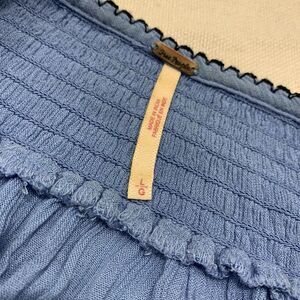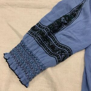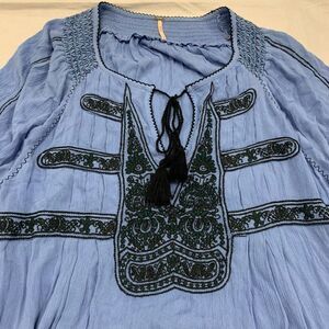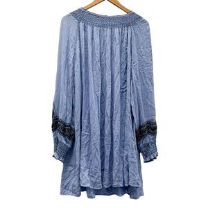 Free People Sz L Wind Willow oversized embroidered shirred mini dress boho blue