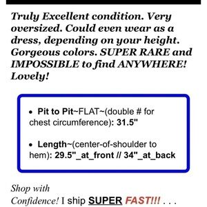 Excellent condition. Very oversized. Could even wear as a dress, depending on your height. Gorgeous colors. SUPER RARE and IMPOSSIBLE to find ANYWHERE! Lovely!