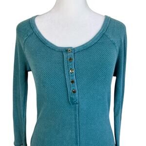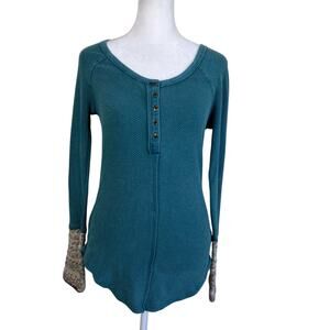 Free People Sz S Alpine Cuff Henley Thermal Teal & Tan Waffle Knit Fitted