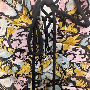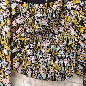 Free People Sz S Mabel Floral Boho Bohemian Blouse Ruched Tie Front Smocked Back Top. Chic floral print top with a stylish design. Flowey bell sleeves. Tie front. Black, white, yellow, blue, pink color way in floral. Peekaboo cutout back. Perfect for any occasion.