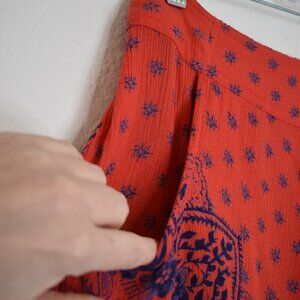 Pre-owned, good condition. No visible holes or stains. Normal signs of wear. Navy blue mandala print over a red background. Pull on. Waistline is V-shaped in the front and smocked in the back. Oversized leg opening. Waist pockets. Size per tag: XS (Extra Small) Fabric: 100% Rayon. Made in India. Size per tag does not guarantee desired fit, please see pictures for measurements.
