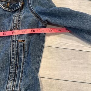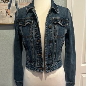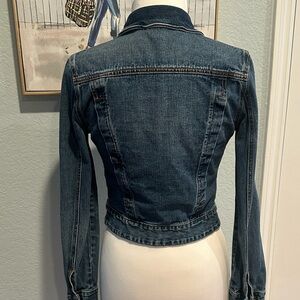 Chic denim jacket with button closure. Features classic stitching and pockets. Ideal for casual wear.
