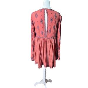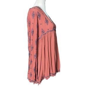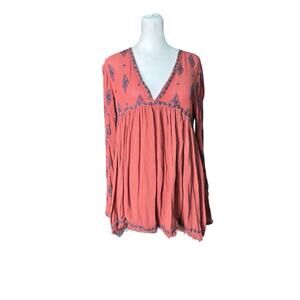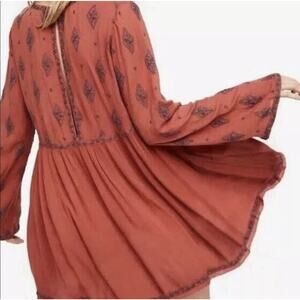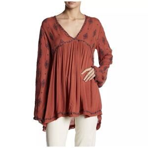 Free People Sz XS Rust Embroidered Boho Babydoll Tunic Top Flowy Peasant Earthy
