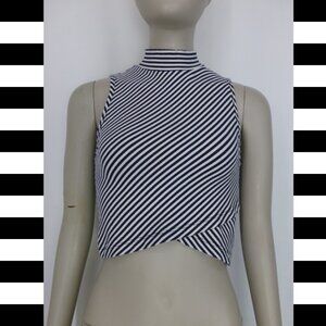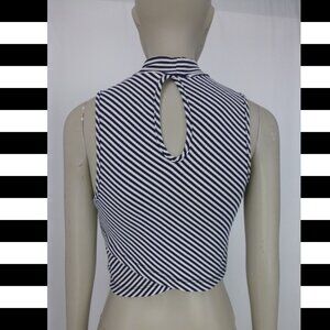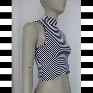 Description: Pre-owned and still in good condition. Mock Neck. Crop Top. Asymmetrical hem. Keyhole opening at back. Sleeveless. Made in the USA.
