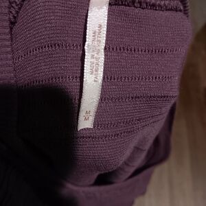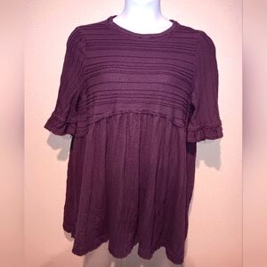Stylish purple top with textured design and short sleeves. Features a ruffled hem for added flair.