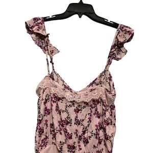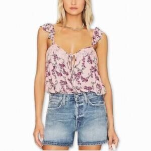 This charming Free People bodysuit features a delicate pink floral print with feminine ruffle sleeves and a romantic lace-up front detail. This bodysuit combines bohemian elegance and versatility for any occasion.