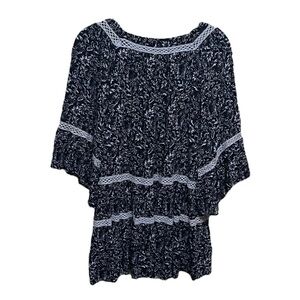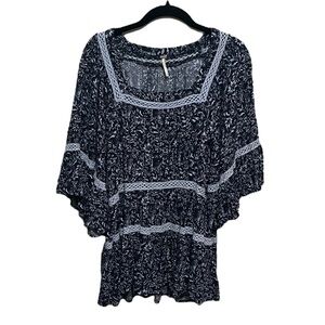 Free People Talk About It Tunic. Blue tiered ruffle tunic. Floral print. Crochet trim. Vintage styling. Square neck. 3/4 Ruffle bell sleeves. Two tone blue. 100% Rayon.
